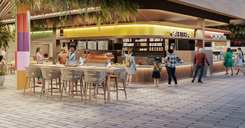 Características del proyectoPlaza con zonas de esparcimiento al aire libre: kioscos, áreas verdes, área gastronómica, gimnasio, canchas de pádel y universidad; cimentaciones aisladas y estructura metálica; alturas libres ~5 m para mezanines; iluminación exterior en muros y pisos; vegetación perimetral; 3 módulos de elevadores, escaleras eléctricas, oficinas administrativas, baños públicos y sistema contra incendio (bomba y cisterna).